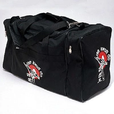 This bag can hold virtually everything. Made of heavy nylon abrasion resistant fabric, the zippered top flap offers you full access into the bag. Two extra wide zippered side compartments feature a mesh panel to allow your clothes or shoes to breathe and dry out. Detachable and adjustable shoulder strap. Taekwondo logo on each end plus on front. Measures 27″ x 15″ x 12-1/2″.